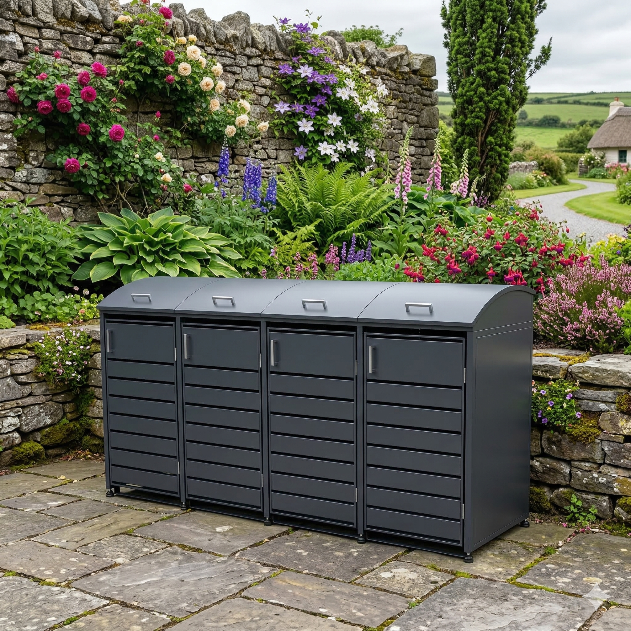 I couldn’t be happier with this 4-bay storage unit. We have the full set of bins—waste, recycling, glass, and compost—and they used to be a real eyesore at the front of the house. This unit has completely hidden them and actually makes the driveway look much more organized and modern.