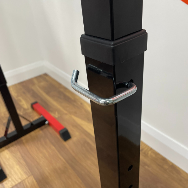 Primary Barbell Support: The main upright J-hooks feature an extensive 16-position adjustment range, allowing you to precisely set the barbell height anywhere from 106 cm up to 170 cm. This critical flexibility means you can achieve the perfect starting position for heavy squats, ensure the optimal height for an overhead press from a rack position, or match the bar height precisely to your bench for bench presses.