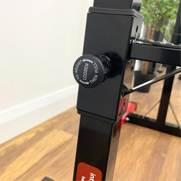 Secondary Safety Support (Spotter Arms): For added security during solo training sessions, the rack includes a secondary safety catch system. This support offers a 6-position adjustment range, customizable between 87 cm and 157 cm. These spotter arms provide a reliable safety net, giving you the confidence to train to failure during bench presses or deep squats, knowing the bar can be safely dropped without injury or damaging your floor.