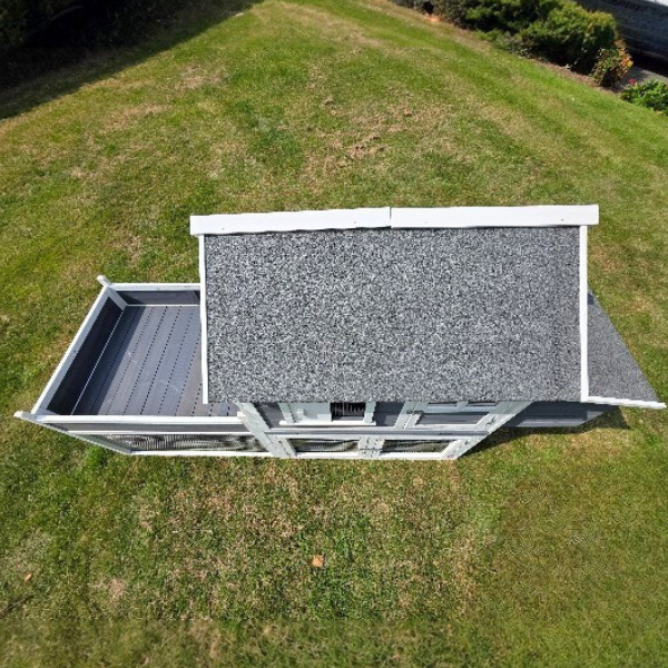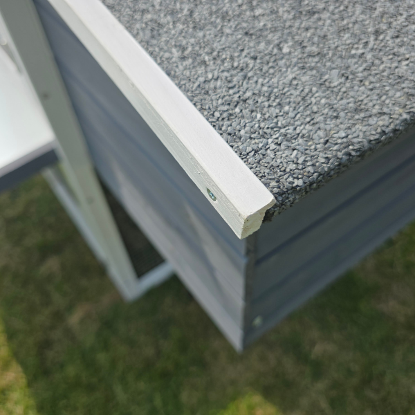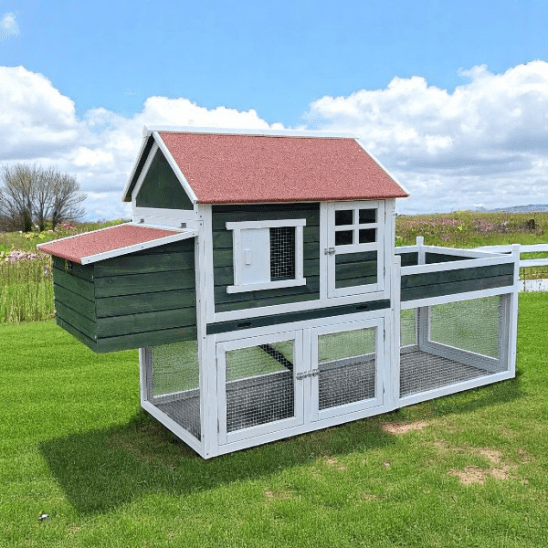 Available in two timeless colour combinations – Grey & White and Dark Green & White – this chicken coop is a beautiful addition to any outdoor space. Its elevated design creates a sheltered area underneath, perfect for shade and dust bathing, while stylish roof and window details add visual appeal and extra weather protection.