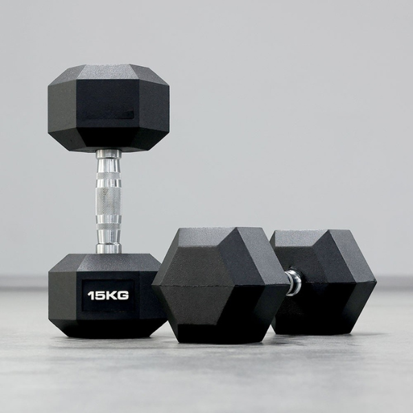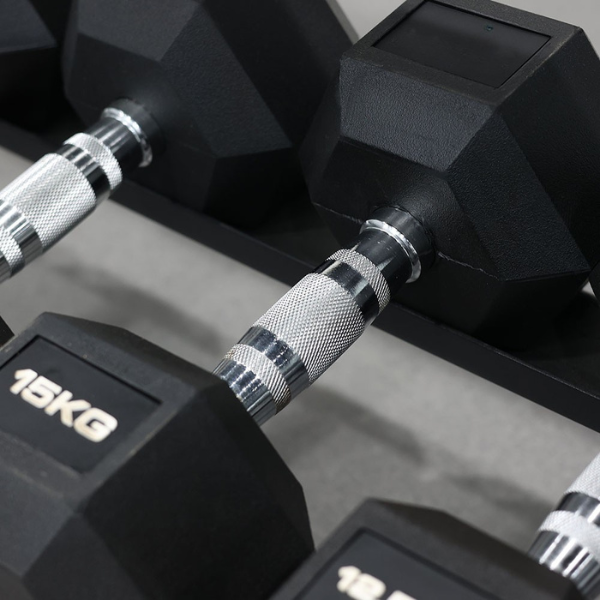 Each dumbbell features a hexagonal-shaped head coated in shock-absorbing rubber to:
